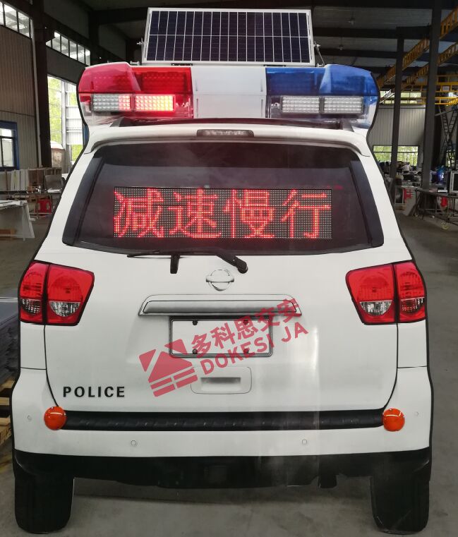 1、工藝說明:又名“假警車”,標志整體版面采用警察后背照片噴繪而成,版面設置簡易紅藍爆閃燈、“后窗”采用LED顯示屏顯示警示標語,剎車燈采用LED發(fā)光燈珠點陣,整體外形酷似警車背部。整體采用方管斜撐結(jié)構(gòu),能有效替代警車警示功能。