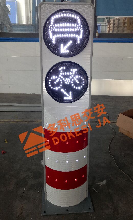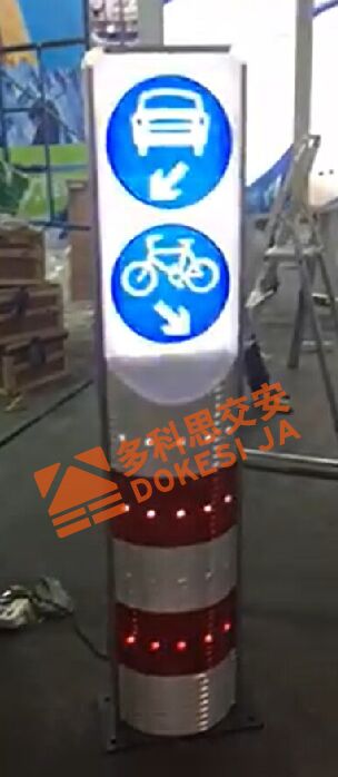 2、基本說(shuō)明:一體式柱體結(jié)構(gòu),標(biāo)志版面圖案中設(shè)置機(jī)動(dòng)車道左指引、非機(jī)動(dòng)車道右指引,柱體上設(shè)置警示發(fā)光管,采用太陽(yáng)能蓄電池供電,設(shè)置于機(jī)非隔離端口,提高路權(quán)指引醒目性、警示性、易捕捉性。