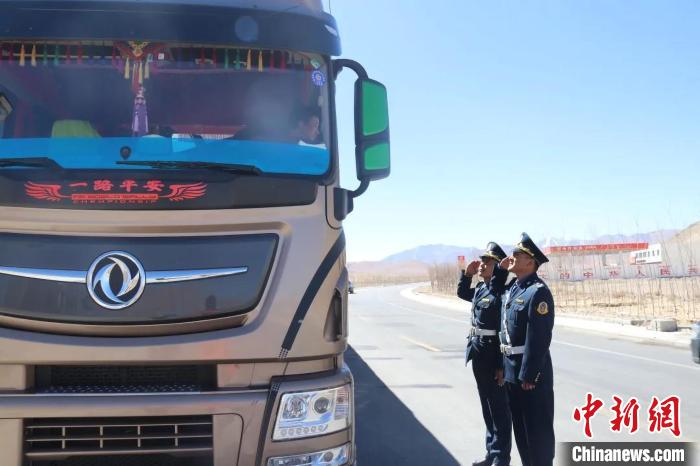 圖為阿里公路部門路政執(zhí)法人員檢查貨運車輛。西藏自治區(qū)路政管理局供圖